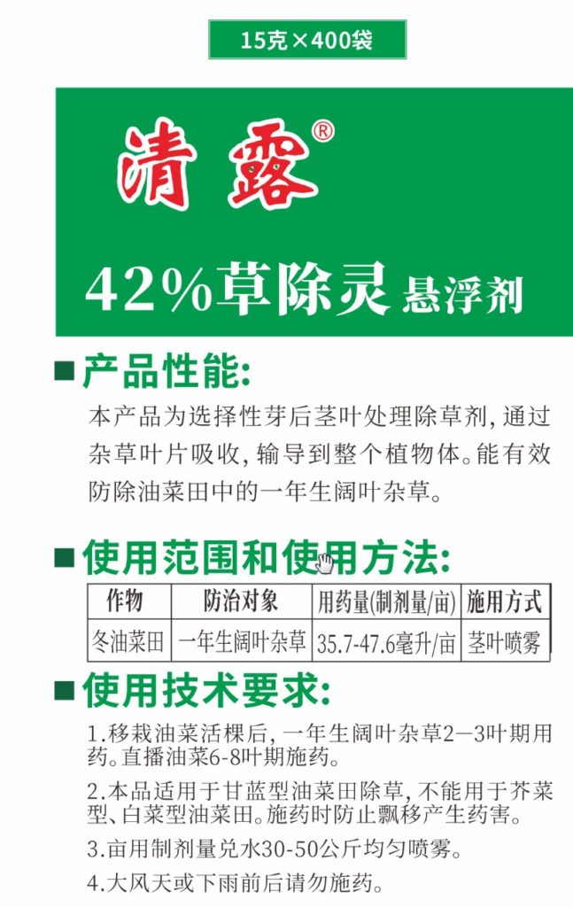 [使用技術要求]1.移栽油菜活棵后,一年生闊葉雜草2-3葉期用藥。直播油菜6-8葉期施藥。2.本品適用于甘藍型油菜田除草,不能用于芥菜型、白菜型油菜田。施藥時防止飄移產(chǎn)生藥害。3.畝用制劑量兌水30—50公斤均勻噴霧。4.大風天或下雨前后請勿施藥。5.油菜每個生產(chǎn)周期最多使用1次。